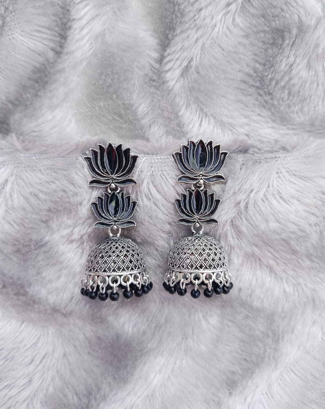 Black Lotus Two Layer Silver Jhumka Earrings